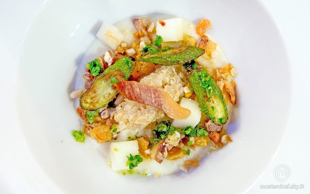 Scolare la pastinaca e frullarla con il frullatore a immersione insieme al formaggio e un pizzico di sale per ottenere una crema liscia. Scolare le creste di gallo, spellarle e farle saltare in una padella con poco olio. Scolare anche la quinoa.