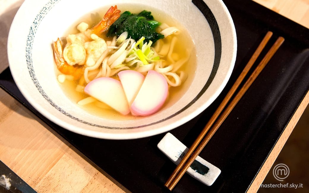 Preparare la salsa udon mescolando il mirin con la salsa di soia. Preparare il brodo per i noodles miscelando una parte di salsa udon con 9 parti di brodo dashi.