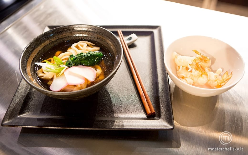 Distribuire i noodle nelle fondine e coprirli con il brodo dashi. Aggiungere 4-5 fette sottili di surimi, una quenelle di spinaci e il cipollotto, servendo la tempura di gamberi a parte.