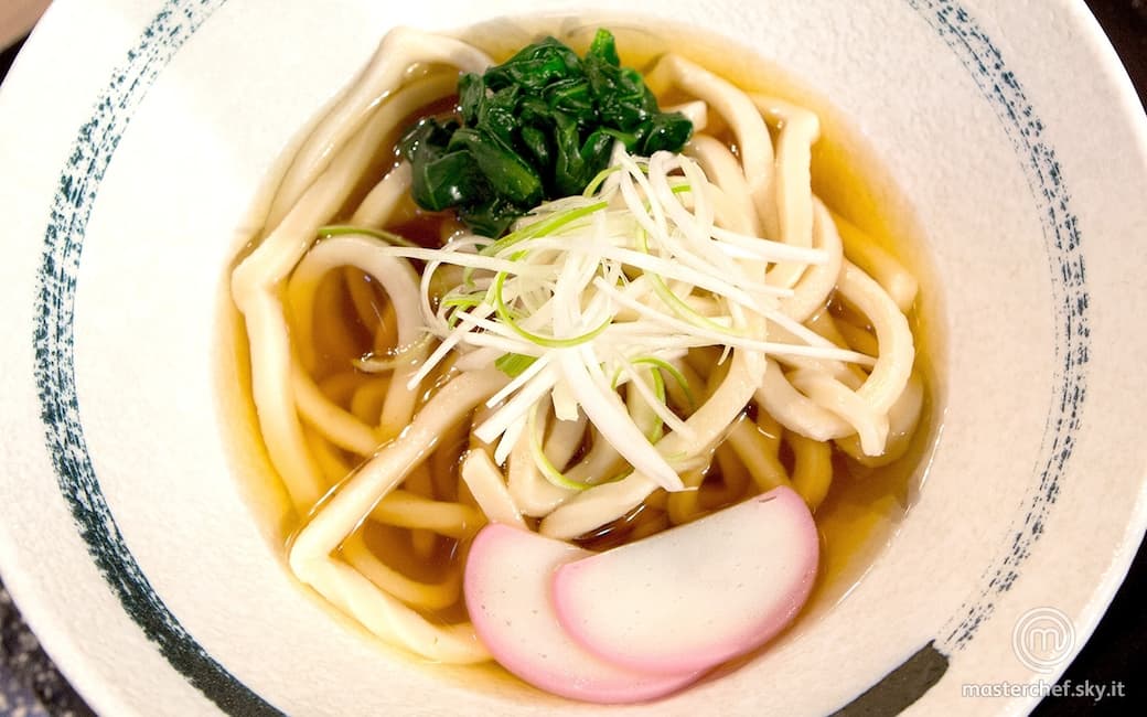 In una ciotola da udon mettere gli spaghetti, poi il brodo fino a coprirli. Decoriamo con le foglie di spinaci precedentemente sbollentate in acqua salata e immediatamente raffreddati in acqua e ghiaccio. Decoriamo al centro anche con il cipollotto che avremo avuto cura di tagliare a striscioline e lasciato riposare in acqua e ghiaccio. Aggiungiamo le due fettine di surimi e i due gamberoni in tempura e servire immediatamente.