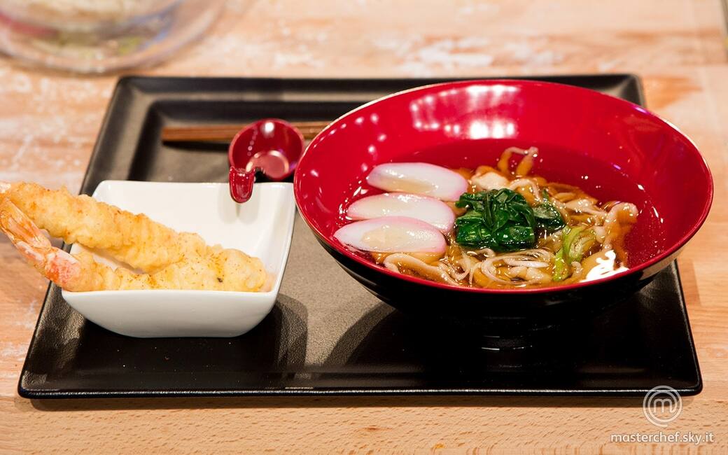 Impiattare gli udon cotti in acqua non salata, il brodo, la tempura, il cipollotto tagliato fine e il surimi.