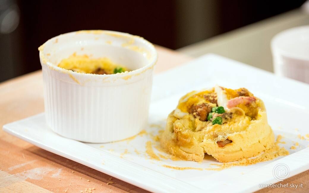 Versare negli stampini uno strato di crema pasticcera, poi il composto di carni miste, quindi le polpettine. Distribuire sopra il prosciutto a listarelle, poi i garganelli, condire con il fondo di cottura delle carni e altra crema, completando con il tartufo a lamelle. Ricavare dalla frolla avanzata 4 dischi leggermente più grandi degli stampini, appoggiarli sopra questi ultimi, sovrapporre la pasta debordante e passare il mattarello per tagliare la frolla in eccesso e sigillare i timballi. Praticare alcuni fori vicino ai bordi con uno stuzzicadenti e infornare a 180 °C per circa 20 minuti. Sformare i timballi prima di servire.