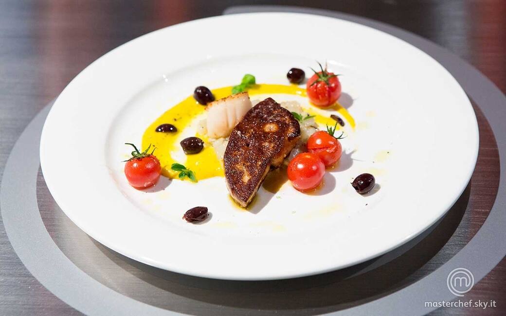Versare nei piatti un cucchiaio di crema di mango, unire gamberi e sedano e sopra disporre il foie gras e le capesante. Condire con l'olio ricavato dalle mazzancolle e completare con i pomodorini e le olive.