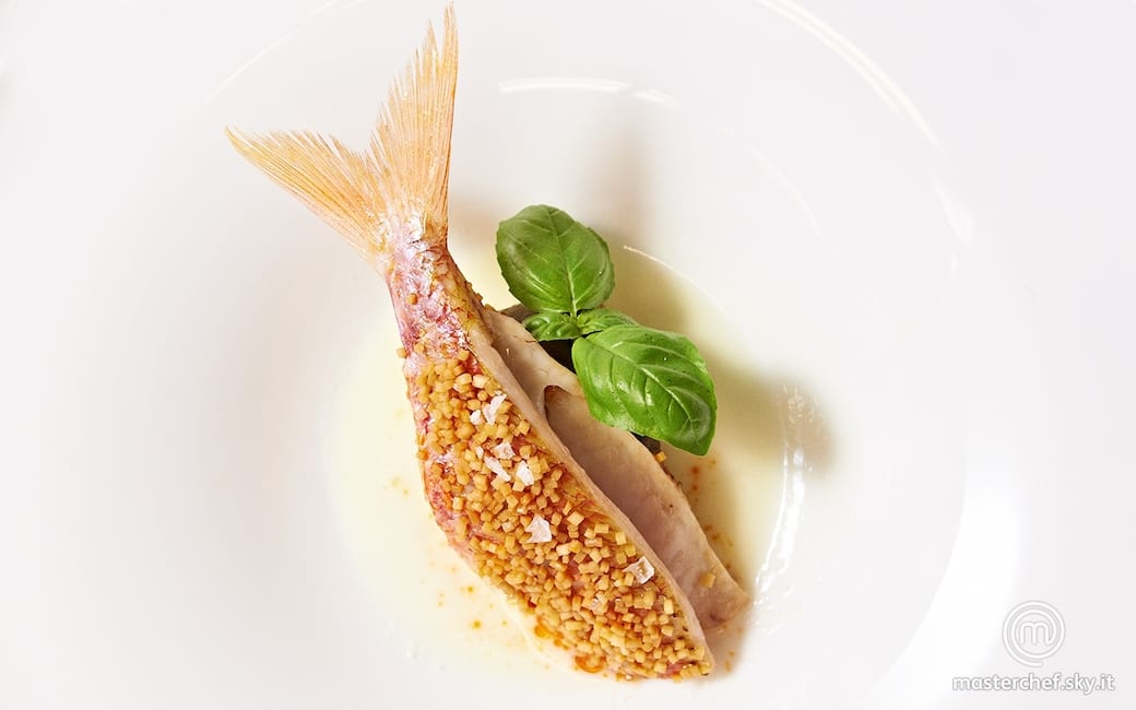 Prelevare il composto di scamorza dal microonde e passarlo allo chinoise. Bagnare con poco olio extravergine di oliva le triglie, massaggiandole, quindi insaporirle con un pizzico di sale di Cervia. Adagiare ogni triglia su un foglietto di carta da forno e trasferire quest'ultimo in una padella moderatamente calda, cuocendo il pesce molto brevemente. Quando la pelle della triglia si sarà colorita, spegnere il fuoco, girare il pesce sull'altro lato e completare la cottura a recipiente coperto. Cospargere il pane fritto sulle triglie, in modo da farlo aderire, e tenere da parte in caldo.
