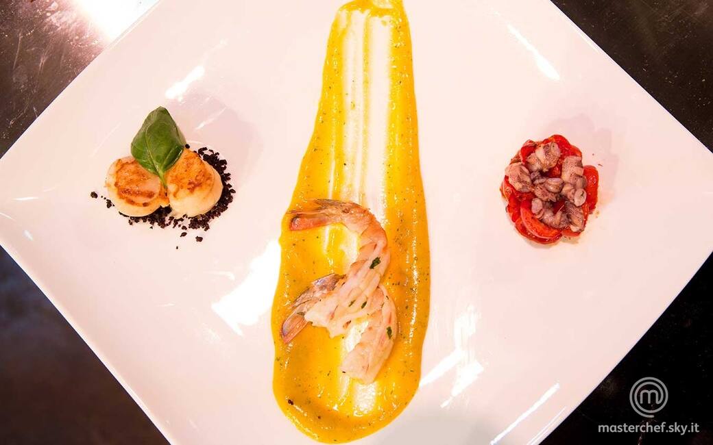 Stendere al centro dei piatti la salsa di mango e adagiarvi sopra le mazzancolle. Con un coppapasta rotondo posizionare su un lato i calamaretti con i pomodorini. Sull'altro lato mettere le olive tritate e appogiarvi sopra le capesante, guarnendo a piacere con una foglia di basilico.