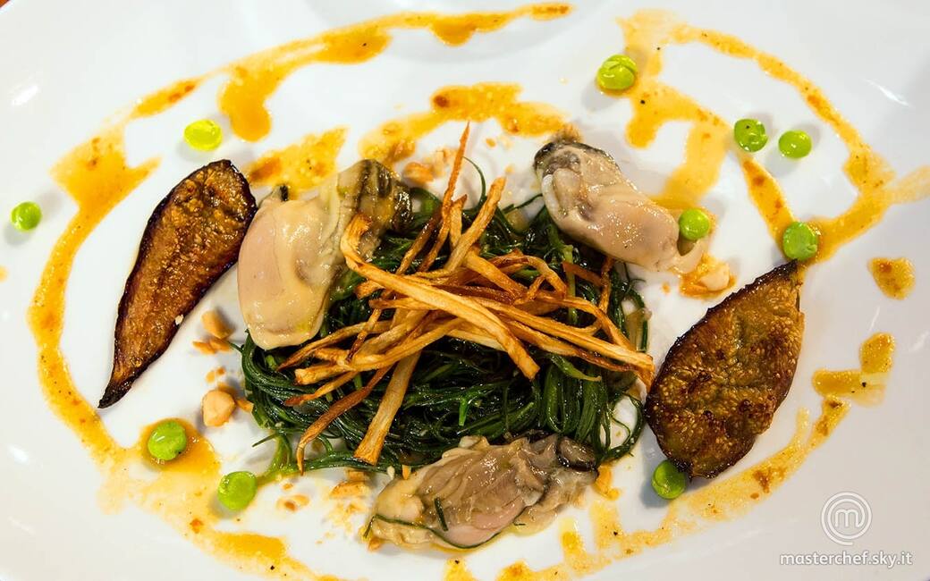 Distribuire la barba di frate al centro dei piatti e appoggiare di fianco le ostriche. Adagiare sopra le chips di sedano rapa e sui lati i fichi caramellati. Condire con l'emulsione di polpa di riccio e cospargere intorno i pisellini crudi e la granella di noci.