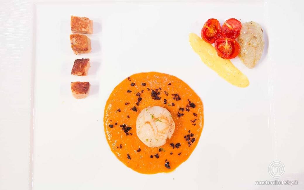 Distribuire al centro dei piatti la crema di mango, adagiarvi sopra una noce di capasanta e guarnirla con pochissima scorza di lime grattugiata e le olive essiccate. Disporre su un lato la tartare di mazzancolle insieme ai pomodorini confit e una piccola striscia dell'emulsione preparata con i coralli delle capesante, completando con i cubetti di foie gras sull'altro lato.