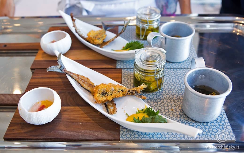 Sbucciare e affettare finemente l'altro cipollotto, quindi farlo caramellare in una padella con poco olio extravergine di oliva, fino a quando sarà traslucido e molto morbido. Distribuire il cipollotto caramellato all'interno degli sgombri con la coda e insaporire con timo, maggiorana e finocchietto. Passare delicatamente i pesci farciti nella farina, premendo piano per non far fuoriuscire la farcia, quindi immergerli nelle uova rimaste sbattute e infine nel panko, facendolo aderire. Friggere gli sgombri farciti in abbondante olio di semi a 160 °C e scolarli su carta assorbente da cucina. Friggere nello stesso olio anche 2 lische.