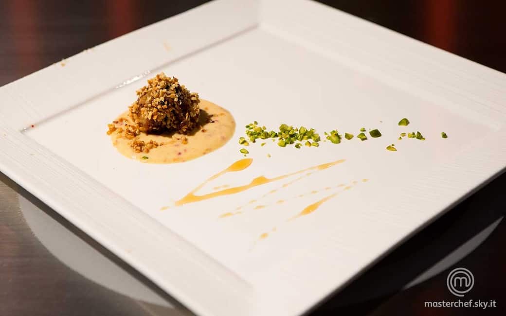 Distribuire la crema di pesca e passion fruit nei piatti e adagiarvi sopra le pepite, guarnendo con un filo di miele e con pistacchi tritati grossolanamente.