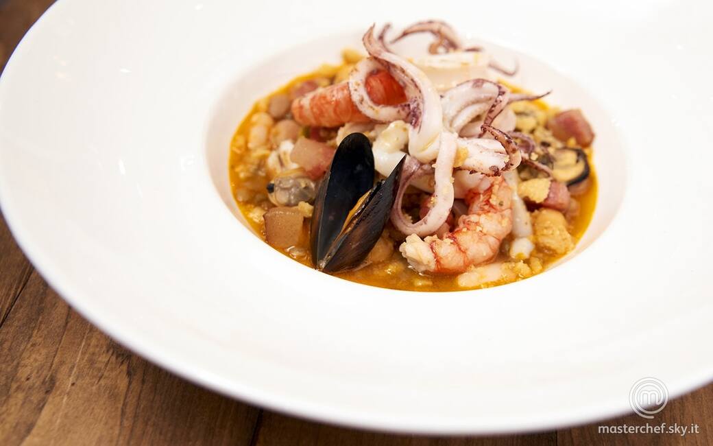 Zuppa del frantoio con insalata di scoglio, guanciale croccante e polvere di taralli