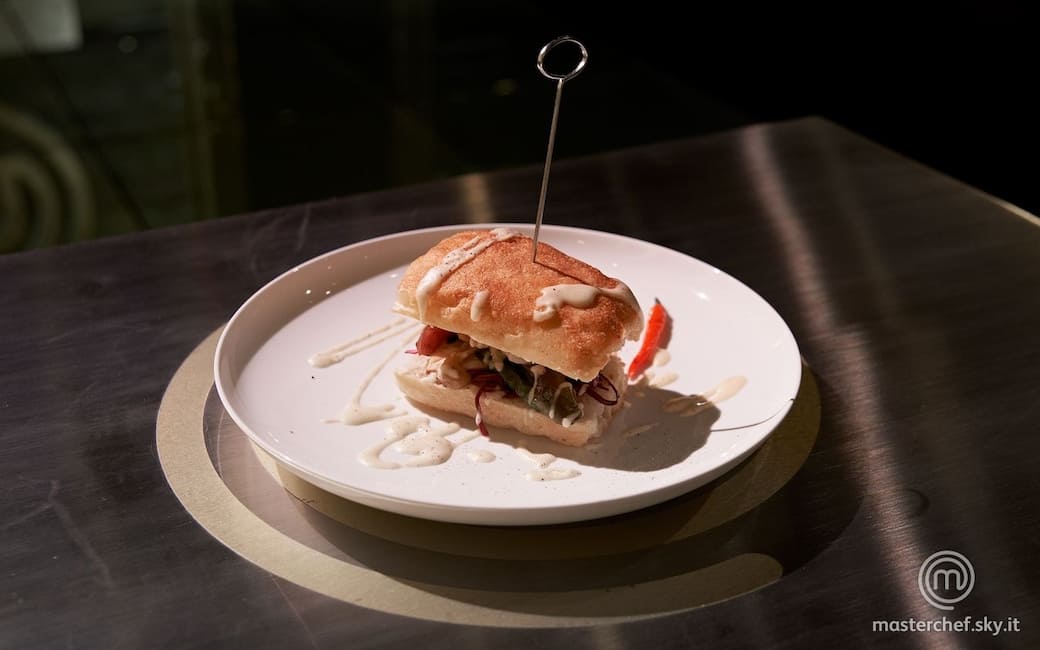 Comporre il panino disponendo alla base il cavolo ben scolato della sua marinatura, il peperone, la scaloppa di cardoncello, la trippa croccante e la crema al pecorino. Aggiustare di sale.