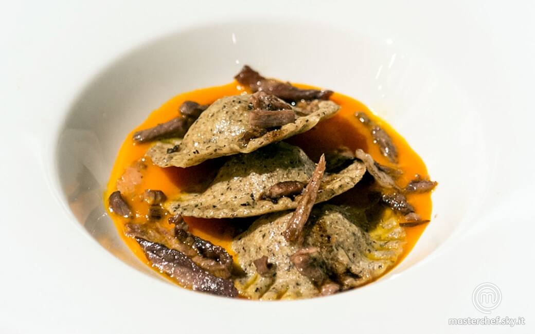 Impiattare disponendo la crema di zucca sul fondo di un cappello del prete, 3 ravioli, il fondo dell’arrosto ridotto e qualche goccia di olio evo.