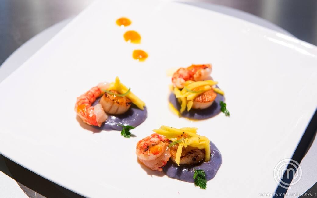 Versare nei piatti 3 cucchiaiate di pure viola, leggermente distanziate, e appoggiarvi le capesante. contornare ogni capasanta con un gambero, distribuire sopra i fiammiferi di mango e una strisciolina di scorza di lime caramellato. insaporire con una leggera macinata di pepe, completare con qualche goccia di salsa di peperoni su un lato e guarnire con qualche fogliolina di prezzemolo.