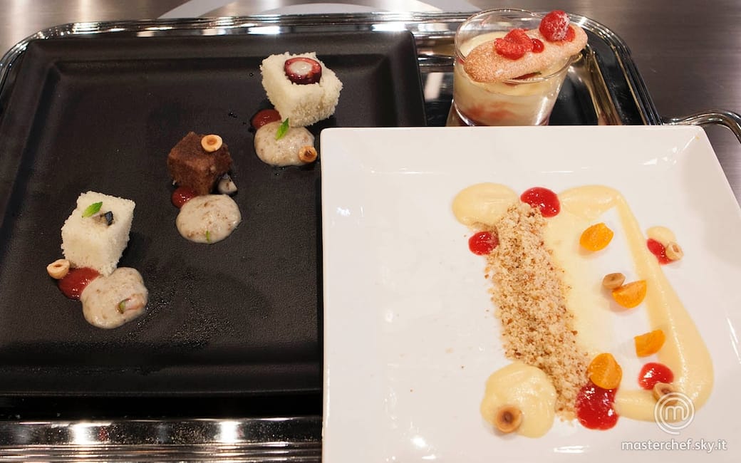 Tostare le nocciole e tagliarle a metà. Sbriciolare finemente la frolla quando è ben fredda, realizzando una sorta di granella. Impiattare con la frolla sbriciolata accompagnata dal lemon curd, decorando con qualche goccia di crema al lampone e qualche nocciola e alchechengi tagliato a metà. In un bicchiere versare la crema ai lamponi alternata con la mousse di ricotta: disporre un savoiardo sul bicchiere e decorare con la crema di lamponi e qualche lampone fresco. Spolverare di zucchero a velo. Ritagliare tre cubi di pan di spagna e bagnarne uno nell’acqua all’anice stellato. Impiattare disponendo la crema di gorgonzola, i tre cubetti di pan di spagna e farcirli con la crema di lamponi. Decorare con nocciole, foglie di menta e frutti di bosco a piacere.