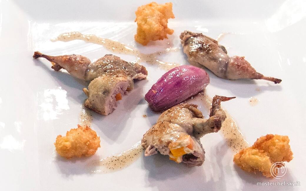 Pulire la testa dell’ombrina e ricavare la polpa delle guance. Passare i tranci prima nella farina, poi nell’uovo sbattuto e infine nel panko rimasto. Riscaldare abbondante olio di semi in una padella e friggere i bocconcini di ombrina. Scolare , asciugare con carta assorbente e salare. Portare a ebollizione l’acqua in una tegame e, nel frattempo, sbucciare la cipolla, ricavando il cuore. Sbianchirlo per 1 minuto, scolarlo e ripassarlo nella padella dove è stata rosolata la quaglia.