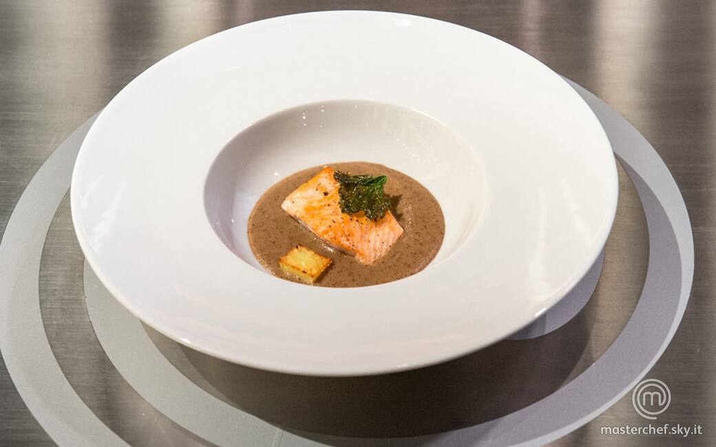 Friggere 4 piccole foglie di rapa bianca in abbondante olio di semi bollente. Impiattare disponendo la crema di patate e radicchio, il salmone scottato, un cubo di patata e una foglia di rapa bianca.