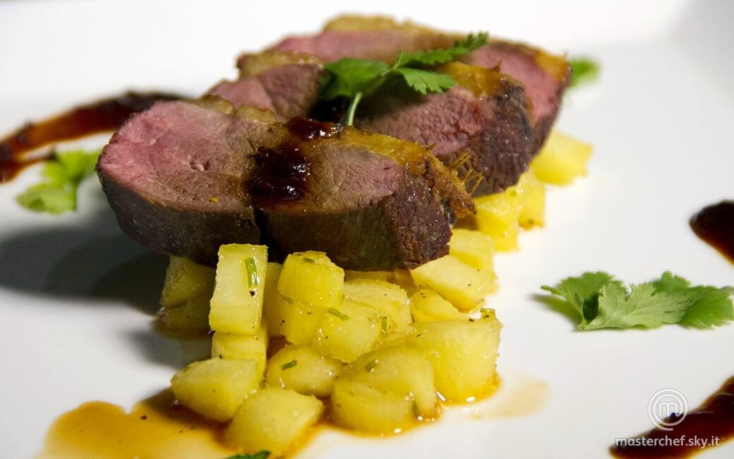 Adagiare il contorno caldo all’ananas alla base del piatto, porvi sopra le scaloppe di petto d’anatra, bagnare con la riduzione e, infine, guarnire con le foglioline di coriandolo.