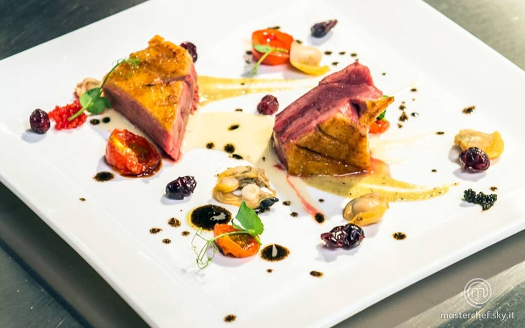Impiattare disponendo il petto d’anatra, le vongole, la salsa all’acqua di vongole, la salsa al cipollotto, l’olio al cipollotto bruciato e i cranberry. Decorare con germogli verdi e uova di pesce.