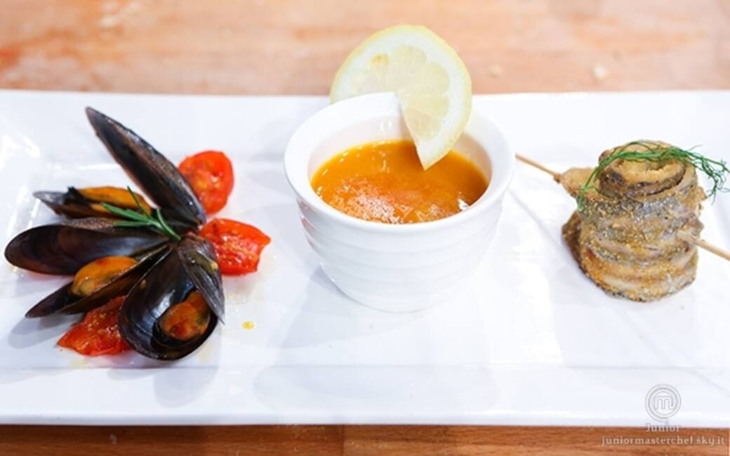 Impiattare su un piatto rettangolare ponendo al centro una zuppetta con il sughetto delle cozze, da una parte l'involtino di pesce spatola impanato e dell'altra alcune cozze adagiate su un letto di salsa di pomodoro.