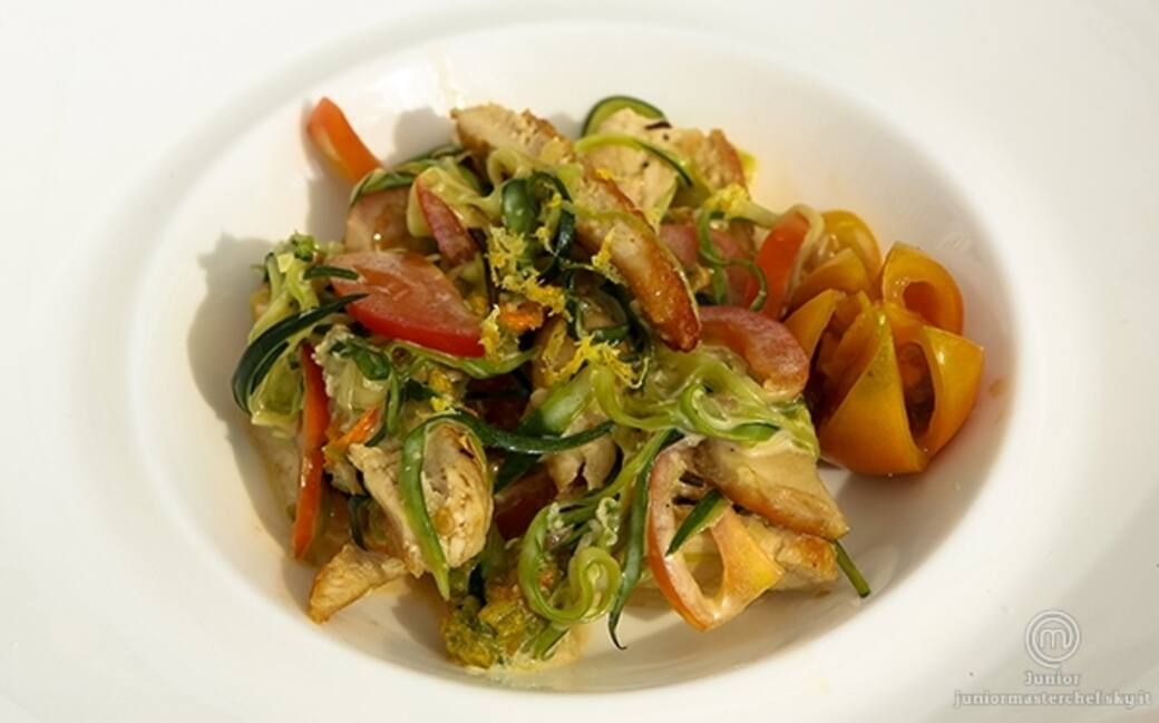 Fare una julienne di pollo e condirlo velocemente nell'insalatiera con olio d'oliva extravergine, zucchine, pomodorini e fiore di zucca.