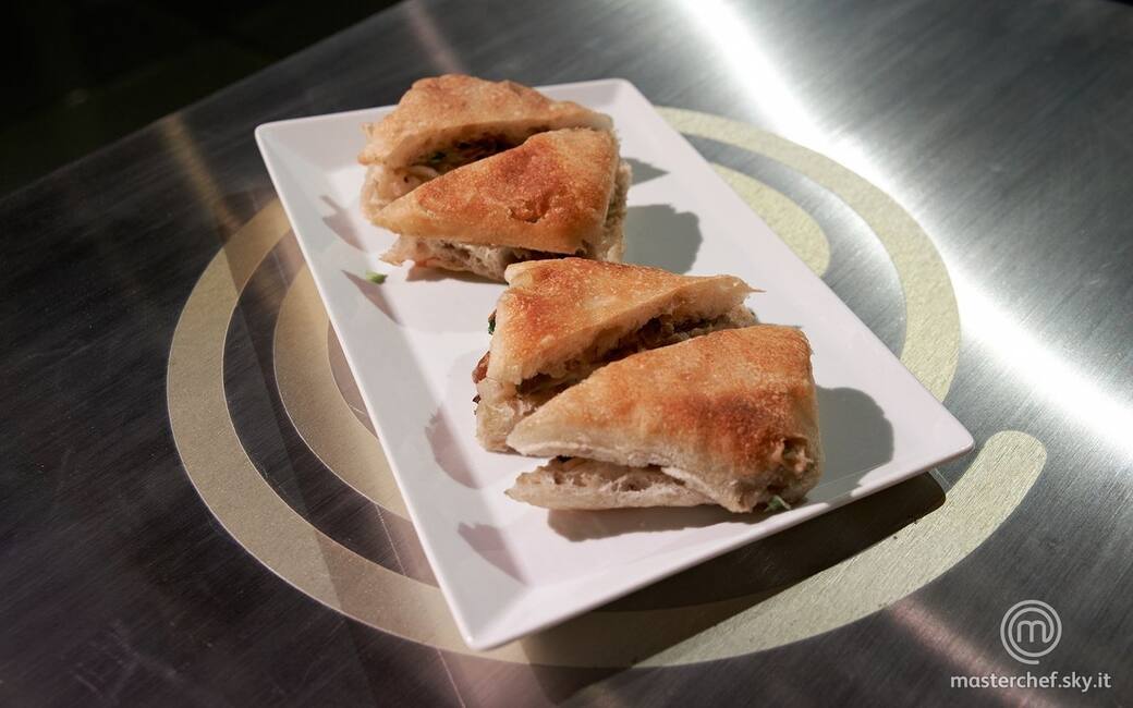 Comporre il panino aggiungendo prima la salsa alle melanzane, poi il battuto di scarola e infine la trippa. Aggiungere qualche zeste di limone e aggiustare di olio evo, sale e pepe.