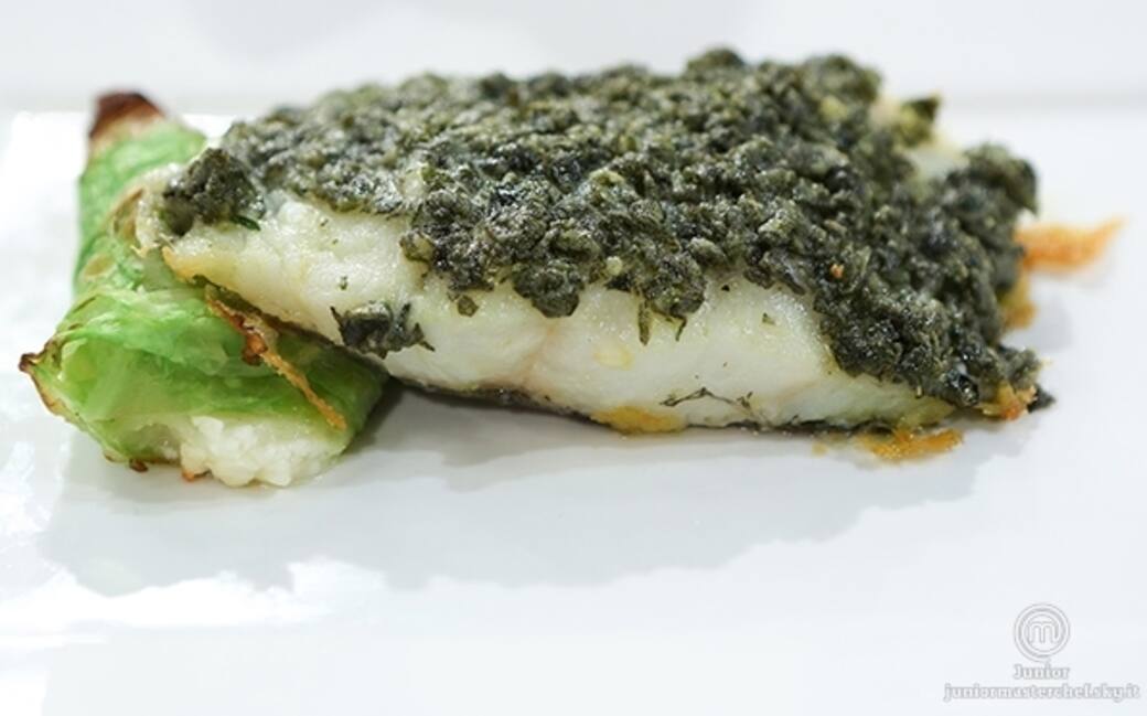 Baccalà gratinato alle erbe aromatiche e rotolini di verza ripieni di formaggio francese