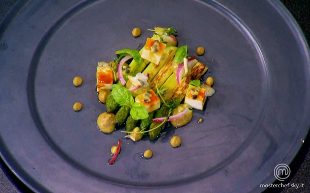 Impiattare un letto di asparagi e spennellare con la riduzione di passion fruit. Aggiungere la crema di avocado a ciuffi, la cipolla marinata, i cubi di sedano rapa caramellati e qualche goccia del succo di marinatura della cipolla. Completare con qualche noce di gorgonzola sciolta direttamente sul piatto con il cannello e ricoperta con una foglia di basilico. Decorare con foglie di basilico e timo.