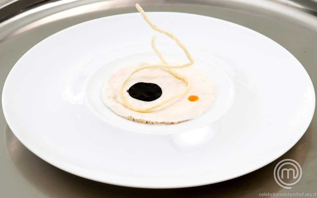 Per la sfoglia nera di seppia unire i rimanenti 100 g di polpa con il nero ricavato dall’umore della seppia. con l’ausilio di un matterello, stendere l’impasto tra due fogli di carta forno oleata. adagiare all’interno di un sacchetto adatto alle cotture sottovuoto e cuocere in forno vapore alla temperatura di 85°c per 6 minuti. raffreddare immediatamente. ricavare dall’impasto 4 dischi regolari del diametro di 3 cm.