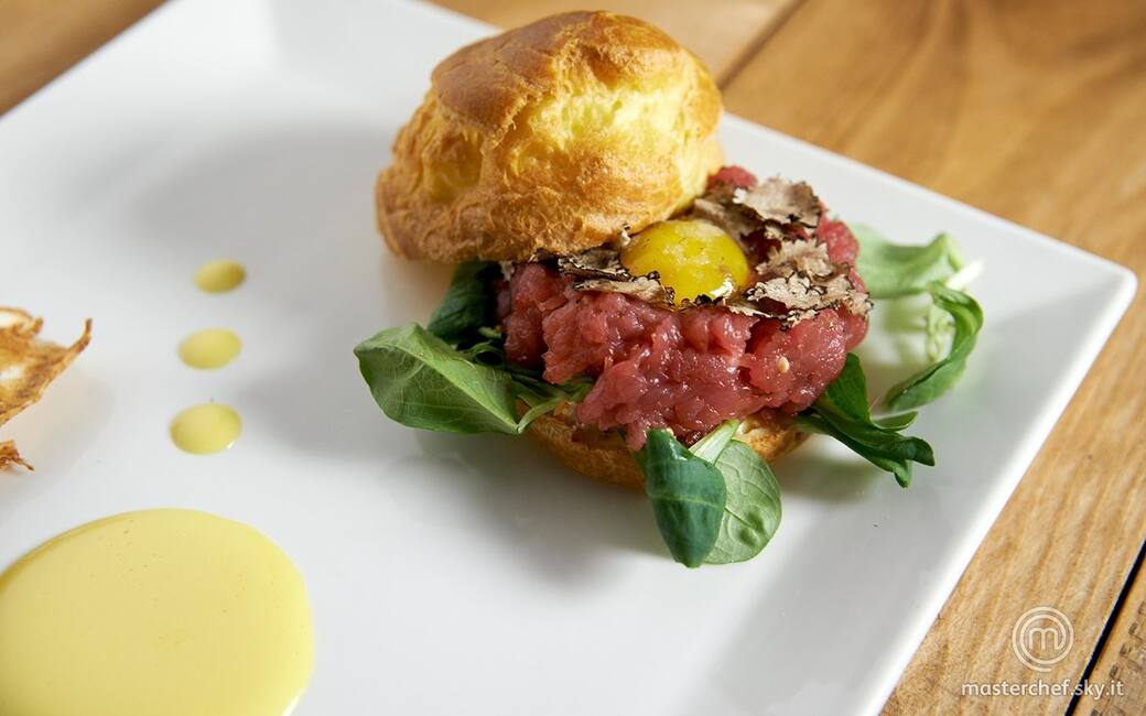 Tagliare il bignè in due parti, aggiungere la crema di caprino, le foglie di valeriana, la tartare, l’uovo di quaglia marinato, il tartufo nero estivo a scaglie, la chips di sedano rapa e la maionese.