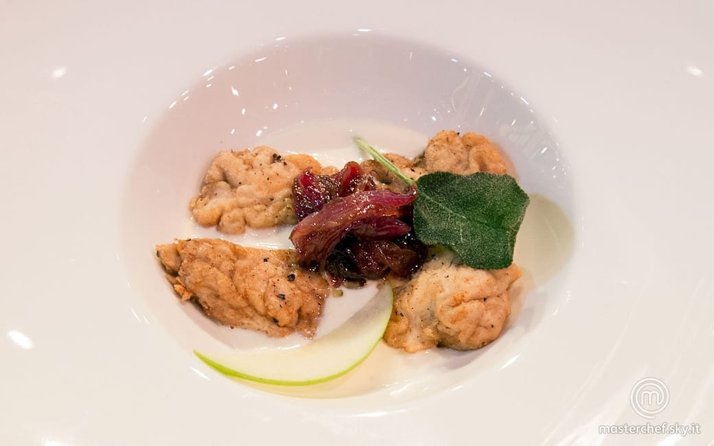 Impiattare versando in una cappello del prete uno strato di fonduta. Disporre i bocconcini di cervello e al centro le cipolle. Adagiare sui lati una foglia di salvia fritta e la fettina di mela.