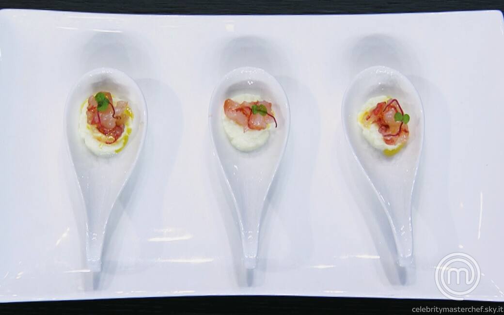 Distribuire la crema di bufala in tre cucchiai di ceramica, adagiarvi sopra un cucchiaino di tartare di gamberi e completare con un germoglio di rapa rossa e qualche goccia d’olio.