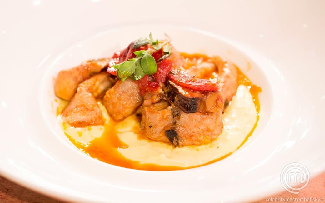 Cacciatorina di anguilla con funghi e mousse di ricotta, mango e sedano rapa