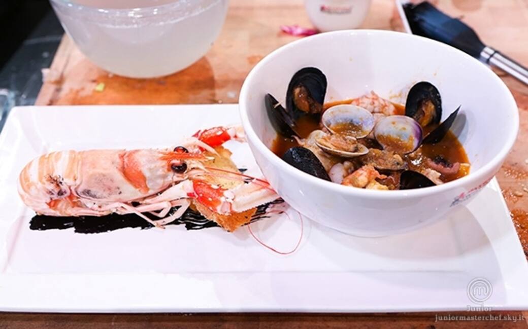 Pulire il pesce, togliendo lische e carapaci, mettendo gli scarti in una pentola con acqua, carota, sedano, cipolla, pepe, sale e un bicchiere di vino bianco, e si fa bollire per circa 20 minuti. far passare le vongole e le cozze sotto sale grosso e acqua. passati 20 minuti, frullare il composto nel passaverdura e filtrarlo nel colino cinese per ottenere il brodo di pesce.