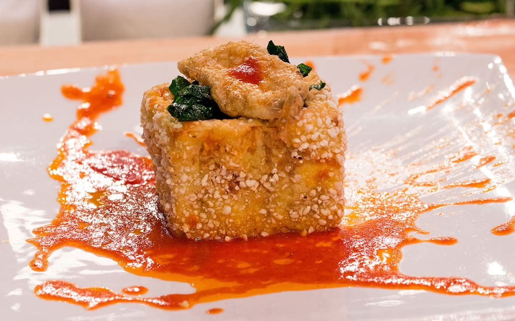 Versare un paio di cucchiai di salsa di pomodoro nei piatti e farvi cadere sopra un bicchiere (o un altro peso) per ottenere un effetto “schizzo”. adagiare al centro i box di melanzana farciti e chiuderli con un’acciuga fritta, come fosse il coperchio, guarnendola con una punta di salsa di pomodoro.