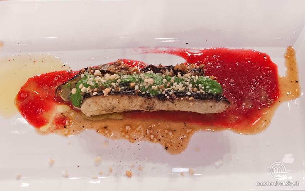 Impiattare disponendo sul piatto il fondo di vitello. Adagiarvi l’anguilla ripiena e versare sul trancio la crema di fave e borragine. Completare con la confettura di fragoline di bosco e la granella di mandorle. Aggiustare di olio, sale e pepe.