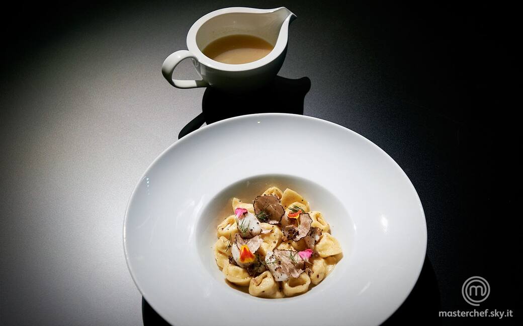 Stendere a mattarello la sfoglia, ricavare 9-12 quadrati di sfoglia di circa 4-5 cm, inserire la farcia e chiudere a cappelletto. Riscaldare una padella con una noce di burro, sale e pepe, rosolare pochissimo le fettine di branzino e rimuoverle. Aggiungere il tartufo a lamelle nel burro e mantecare i cappelletti dopo averli cucinati in acqua inglese, con pochissimo brodo.
