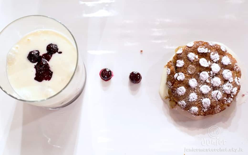 Con un coppa-pasta del diametro di circa 6 centimetri ricavare dalla torta un altro cilindro e tagliarlo nel mezzo per ricavare due dischi della stessa altezza. adagiare in un lato del piatto un cucchiaio di mousse di cioccolato, disporvi sopra uno dei due dischi, bagnare con il succo della coulisse e appoggiarvi un paio di mirtilli interi. ricoprire con la parte superiore della torta che precedentemente spolverata con zucchero a velo utilizzando una grattugia da spatzle per creare una decorazione a pois. dalla parte opposta del piatto appoggiare il bicchiere riempito e fra le due composizioni aggiungere 2 o 3 mirtilli della coulisse.