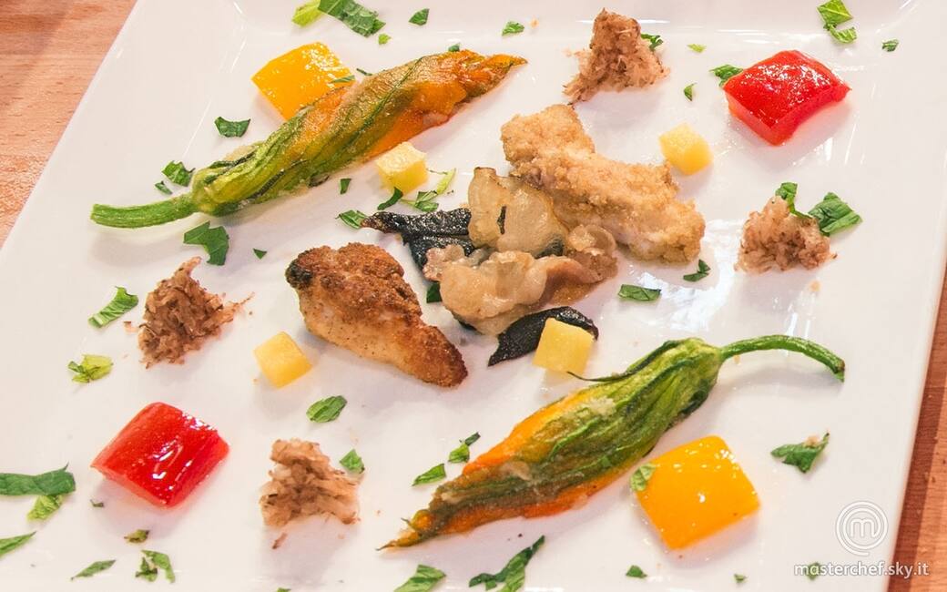 Tagliare la mozzarella a pezzi piccolissimi. Tagliare i funghi a pezzi grossolani, passarli nell'uovo sbattuto e poi nel pangrattato. Farcire delicatamente i fiori di zucca con un’alice e qualche pezzo di mozzarella. Portare a temperatura abbondante olio di semi in una pentola e friggere i fiori di zucca i funghi e la pancetta fino a farla rosolare.