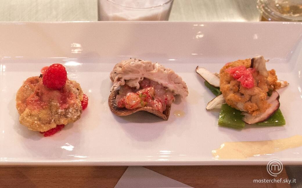 Impiattare disponendo le taccole tagliate a pezzetti, i funghi e il cervello al forno, completando con la maionese al pompelmo. Continuare con la patata viola fritta, la tartare di gambero e il cervello sbollentato e concludere con la riduzione a crudo di lamponi, il cervello fritto e un lampone a crudo.