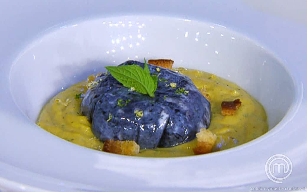 Distribuire la crema di patisson nei piatti e adagiarvi sopra, molto delicatamente, le uova, dopo aver aperto i fagottini. regolare di sale e guarnire a piacere con una fogliolina di timo o di maggiorana.