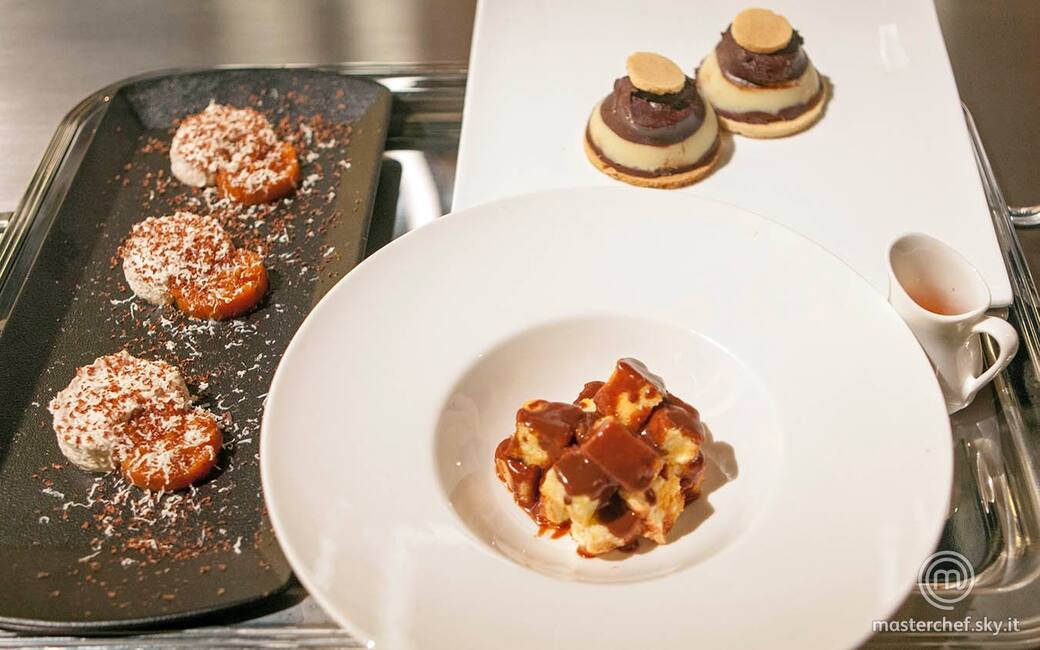 Impiattare la mousse e la confettura con l’ausilio di un ring circolare e grattugiare 40 g di cioccolato fondente sulla mousse e il cioccolato bianco sulla confettura. Tagliare il pan di spagna a cubetti, immergerlo nella bagna alla papaya, scolarlo e disporlo in un cappello del prete. Irrorarlo con una parte di salsa al cioccolato e tenere il resto in una salsiera. Impiattare il tortino ai tre cioccolati capovolto e decorarlo con una noce di crema gianduia e il disco di frolla più piccolo. Completare con il disco più piccolo di frolla.