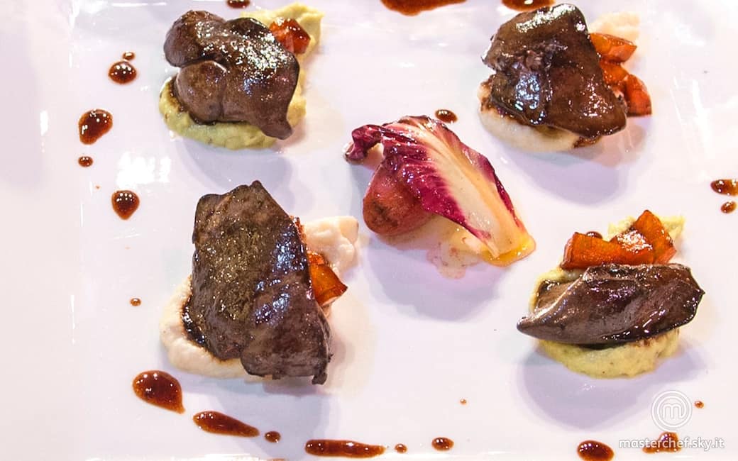 Impiattare disponendo cucchiai delle due creme alternati, i fegatini e le carote e lo scalogno deglassati. Completare con il radicchio al centro del piatto e completare con qualche goccia di fondo di cottura dei fegatini.