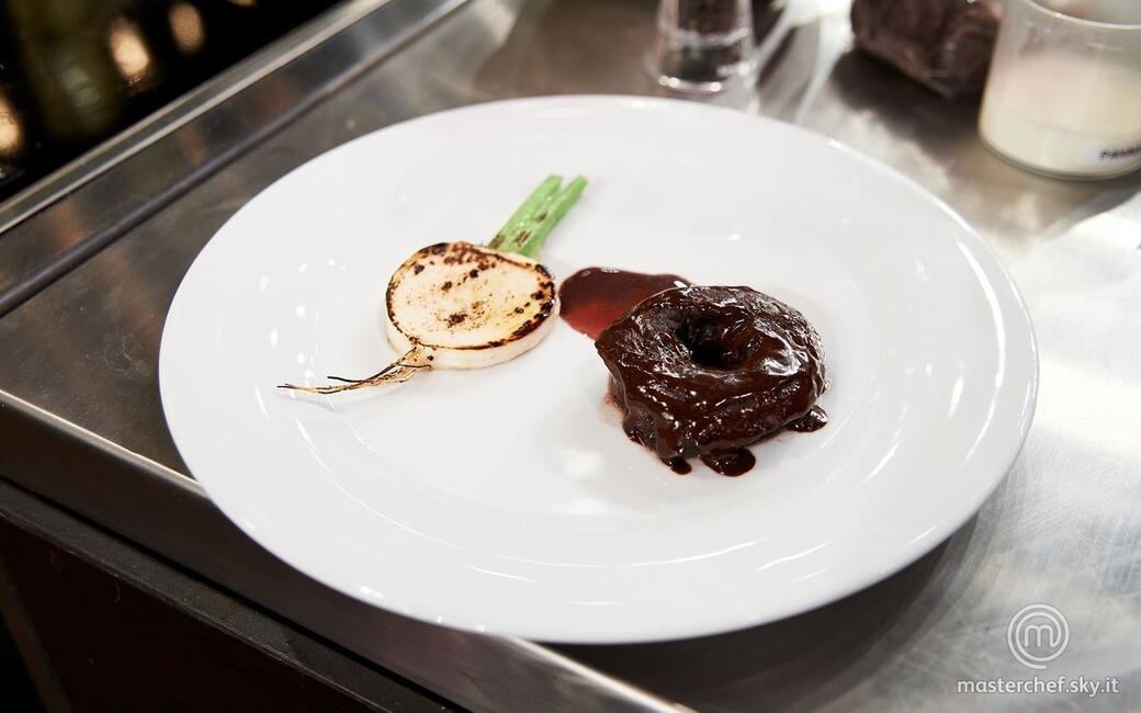 Impiattare la ciambella di cuore irrorata con la salsa al cioccolato e la rapa scottata.