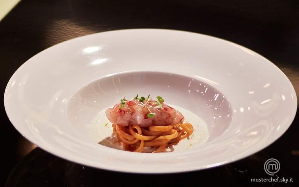 Impiattare disponendo la salsa di stracciatella a specchio, aggiungere le linguine fredde e la tartare. Decorare con basilico e timo e aggiustare di olio evo, sale e pepe.