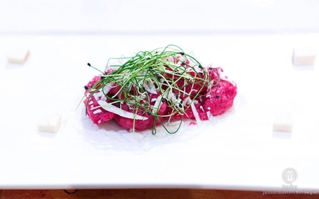 Mettere gli gnocchi in un piatto rettangolare e bianco che ne faccia risaltare il colore. aggiungere una bella grattugiata di ricotta biologica affumicata del cansiglio e sopra una nuvoletta di germogli di porro. completare il piatto con un filo di olio extravergine d'oliva intorno.