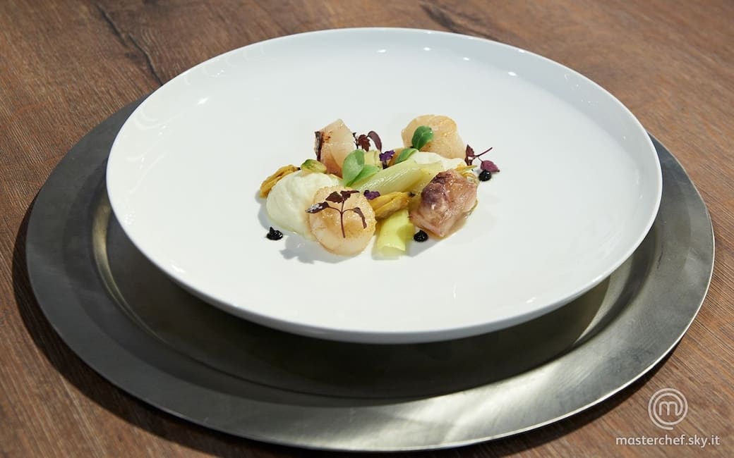 Impiattamento: realizzare tre punte di cremoso di cavolfiore, disporre accanto le capesante e le rondelle di nervetti caramellati, al centro il porro fermentato e qua e là qualche cozza e qualche vongola. Terminare con qualche punta di crema di aglio nero, guarnire con fiori eduli, germogli e qualche goccia d'olio.