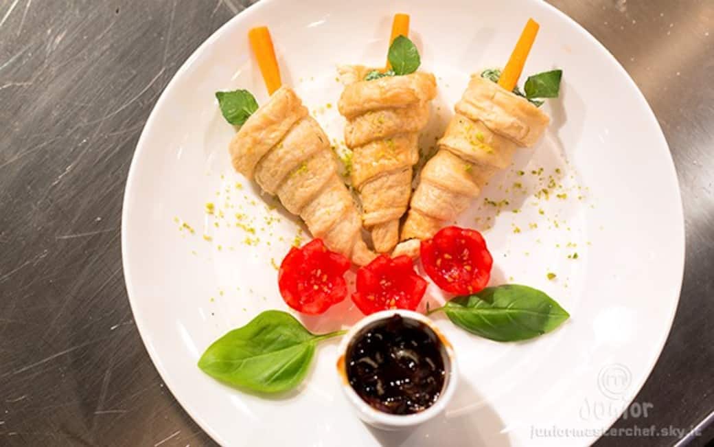 Riempire una sac a poche con il composto, farcirvi i cornetti e decorarli con un pezzetto di carota tagliata a julienne e una foglia di menta. disporli nel piatto da portata accompagnati da pomodorini tagliati a papavero, due foglie di basilico e una ciotolina con la marmellata di cipolla.