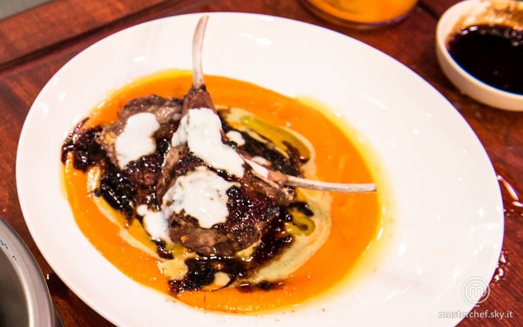 Impiattare versando un fondo di vellutata di zucca e intorno un cerchio di salsa alle bucce e agli spinaci, realizzando un motivo a girella con i rebbi di una forchetta. Adagiare sopra le costolette di agnello, irrorarle con un filo di olio evo, salarle e peparle. Concludere con qualche goccia di riduzione al balsamico e alla mela.