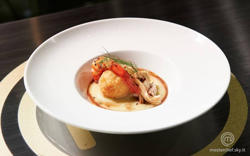 Impiattare disponendo un fondo di crema di patate in un cappello del prete. Irrorare la crema con la salsa al cioccolato e disporre l’uovo fritto, il gambero piastrato, il cervello in olio di cottura e i carciofi marinati. Decorare con foglie di finocchietto e aggiustare di sale e pepe.