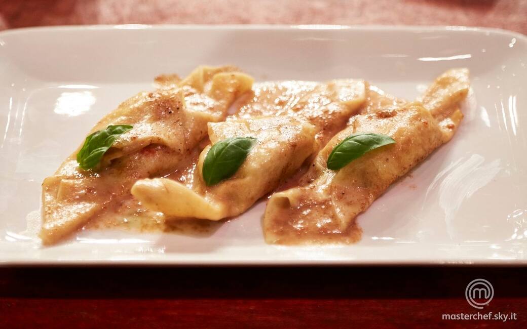 Impiattare i casoncelli nappati con la loro salsa e decorare con foglie di basilico.